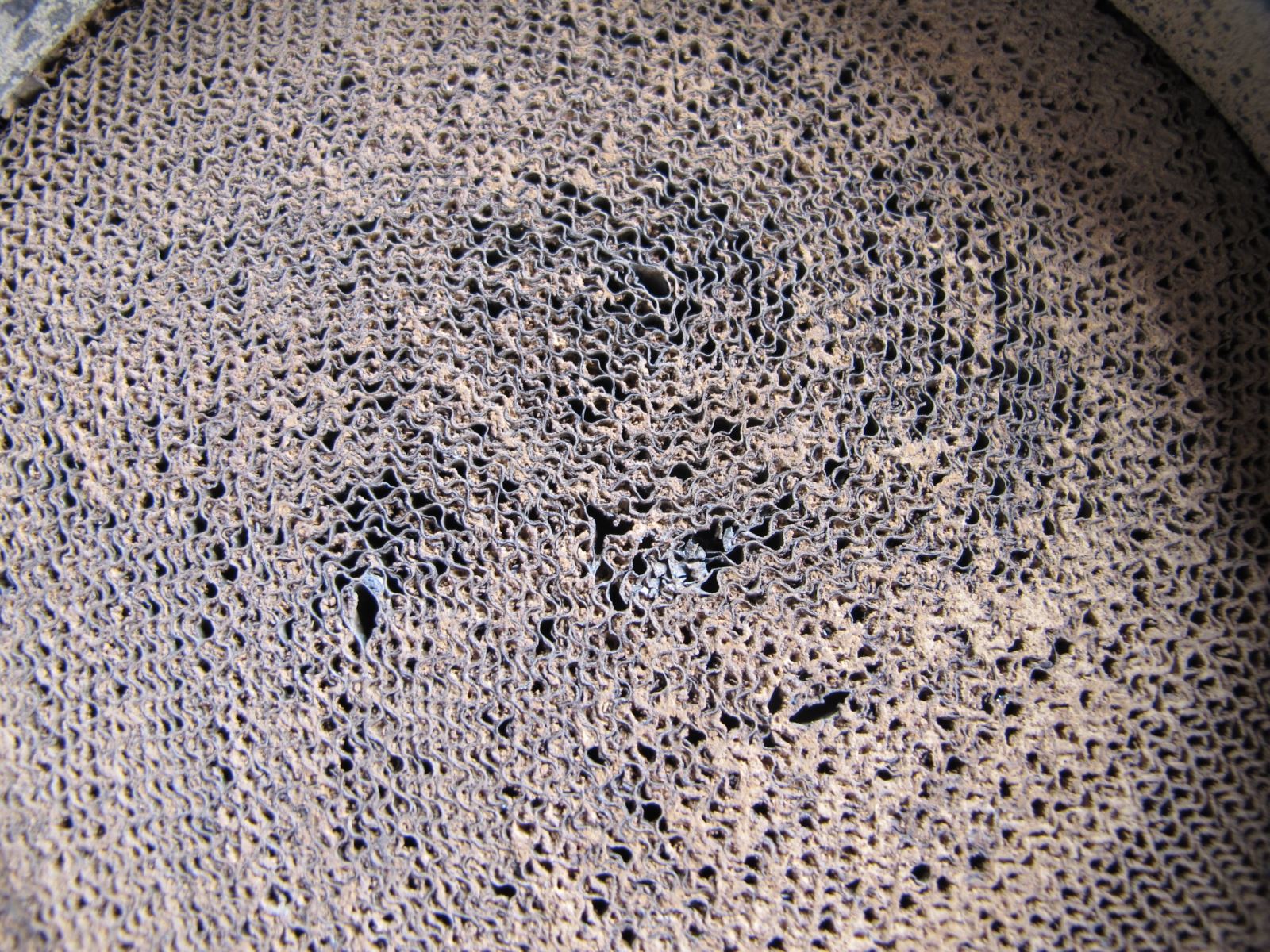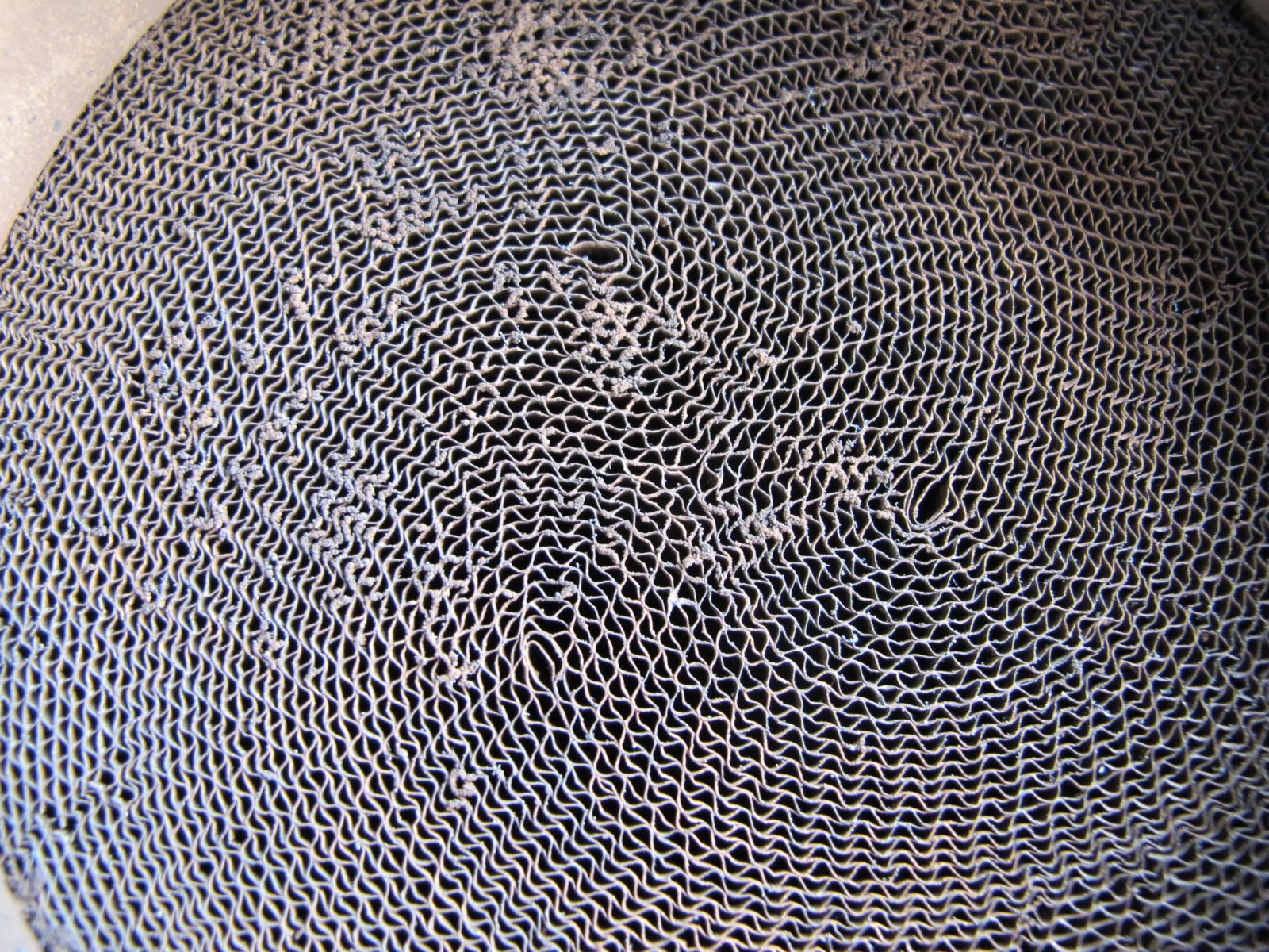 當這些絡合物不斷增加時,容易堵塞催化轉化器蜂窩狀載體的孔道(見圖2),導致排氣不暢,排氣背壓升 高,從而造成汽車動力下降,油耗增加。堵塞嚴重時,會使三元催化轉化器的工作溫度超過一千度,導致催化轉化器燒結而徹底損壞。同時,排氣管也會因高溫而燒紅,有可能導致汽車自燃。