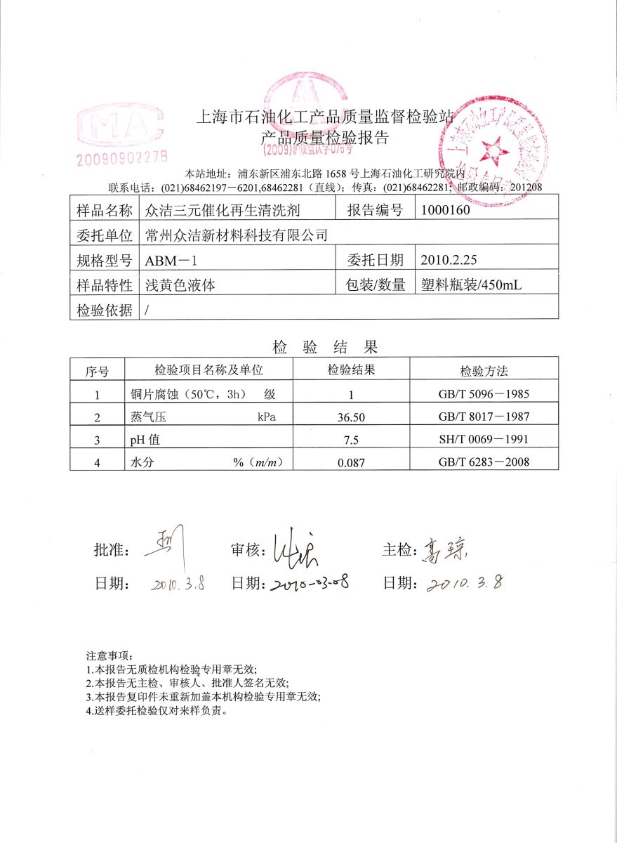 答:眾潔科技的三元催化再生清洗劑是中性清洗劑,不會對汽車發動機造成損害。我公司在研發該產品時參照了我國有關燃油的國家標準中的指標,其目的就是避免該產品對發動機造成損害。該產品的技術指標是符合或高于國家燃油標準的,這就是說只要符合國家標準的燃油對發動機不會造成損害,那么眾潔科技的三元催化再生清洗劑就不會對發動機造成損害。有關該產品的檢測報告可參見產品手冊或登錄眾潔科技網站查詢m.mxmok.com
