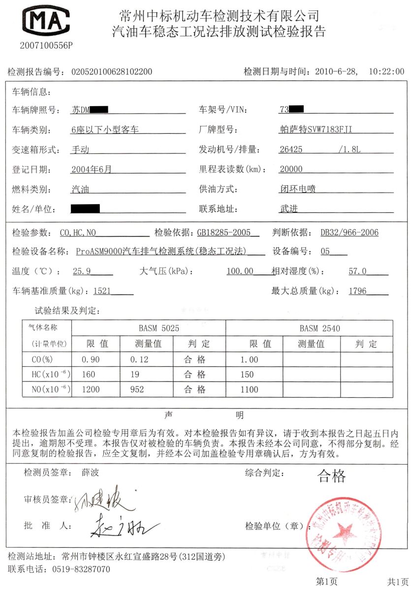 2. 使用眾潔三元催化再生清洗劑后的尾氣檢測報告
