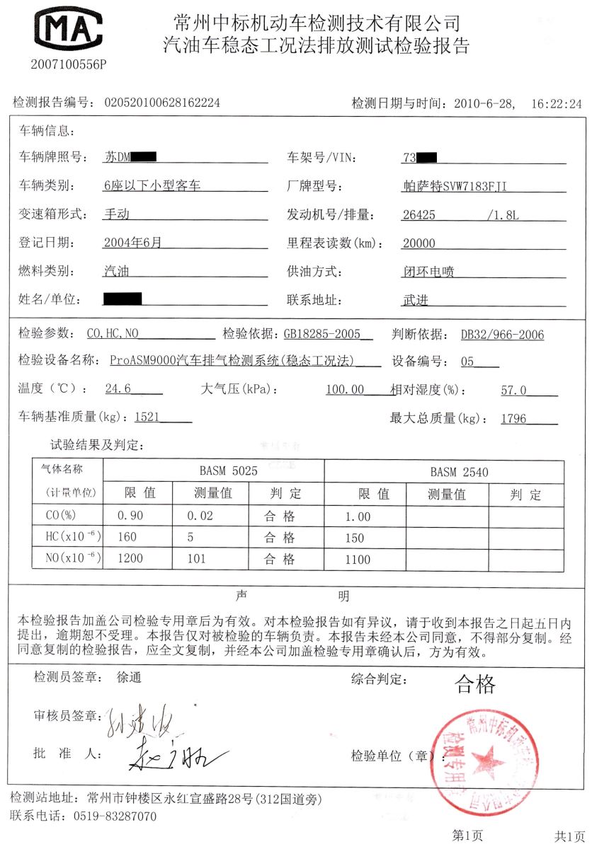2.使用眾潔三元催化再生清洗劑后的尾氣檢測報告